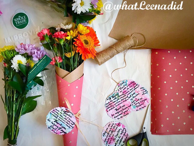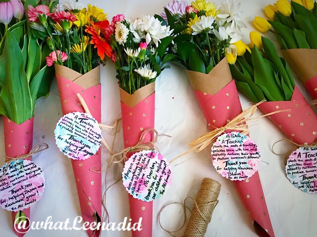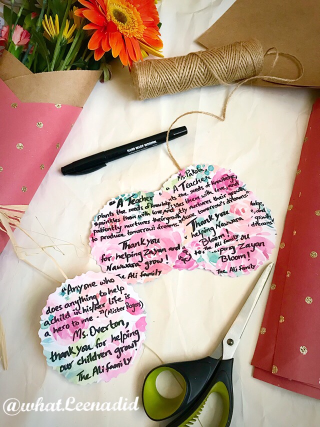 I got this beautiful floral paper pad from Michaels and cut the paper out into circles. After writing the quote on it, I added “Thank you for helping our children bloom/grow”. These became the tags to tie on bouquets.