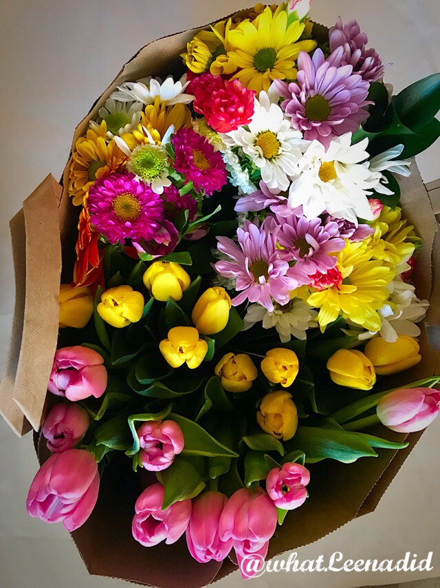 I always buy flowers from Whole Foods to support whole trade florists! I wrapped the bouquets in brown paper & then double wrapped them in a cute gift wrapping paper. They looked super cute! Next I took some twine and wound it around and tied a knot! The tag was attached with the help of a stapler.