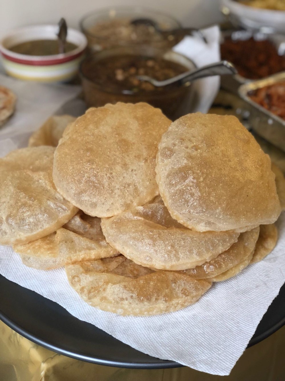 Halwa Puri – the greatest of all breakfast meals in Karachi, Pakistan – is almost always reserved for Sundays. It comprises of freshly fried bread which puffs like a balloon (puri), spicy chickpeas and potato curry (tarkaari), and sweet sticky semolina halwa which oozes ghee in every bite. Trust me, it’s not a breakfast for those with weak stomachs!