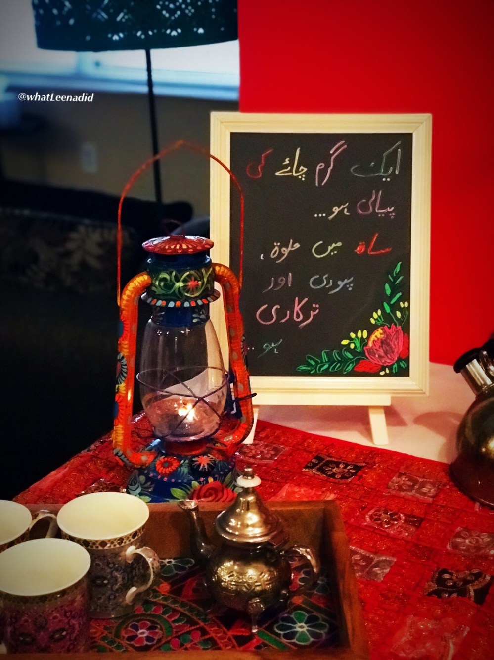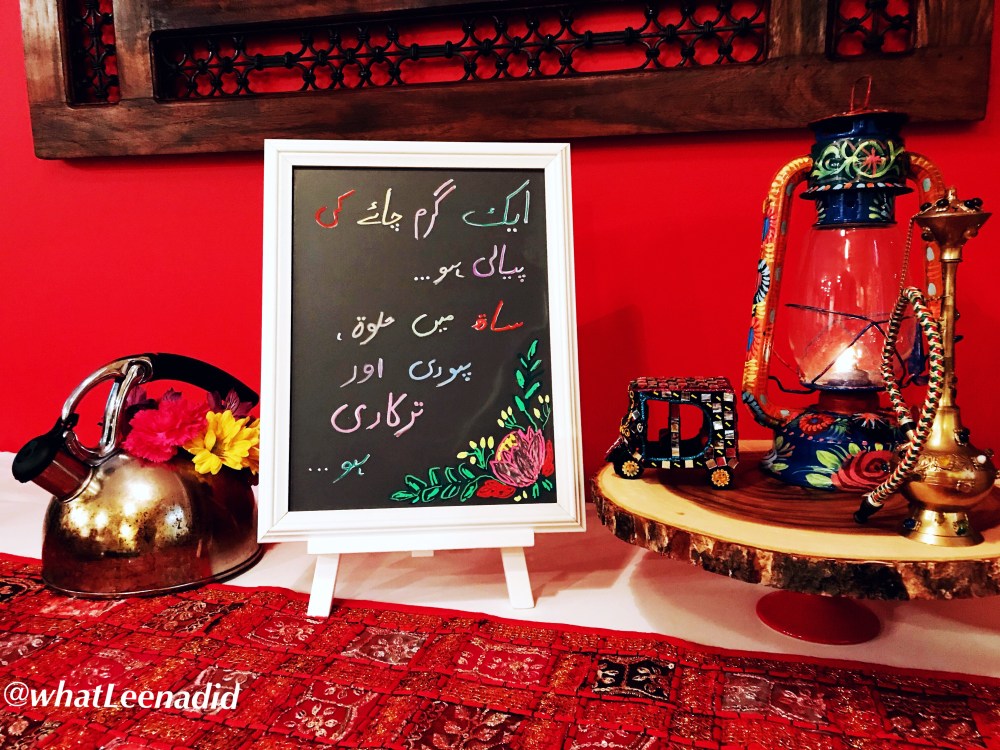 Last week I threw a halwa puri party for my friends. I wanted to capture Pakistan’s culture on my table and so pulled things from around the house to display Pakistani art.