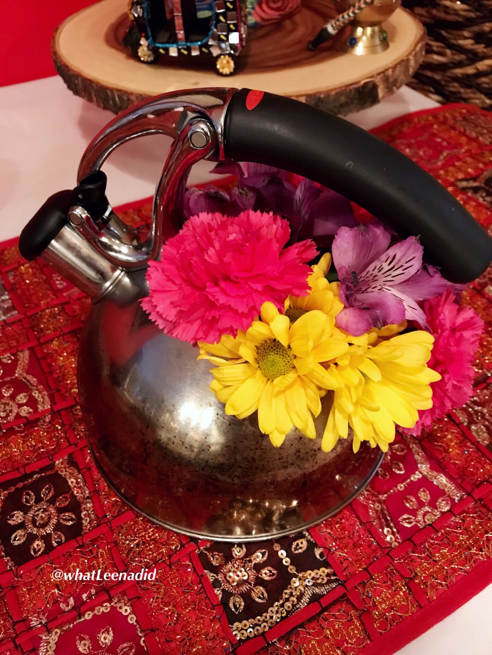 I got this beautiful red runner from Amazon. I also used my tea kettle as a makeshift vase for colorful flowers. This looked so pretty and fun! Displaying colorful mugs in another hand crafted tray made the table decor look so vibrant.