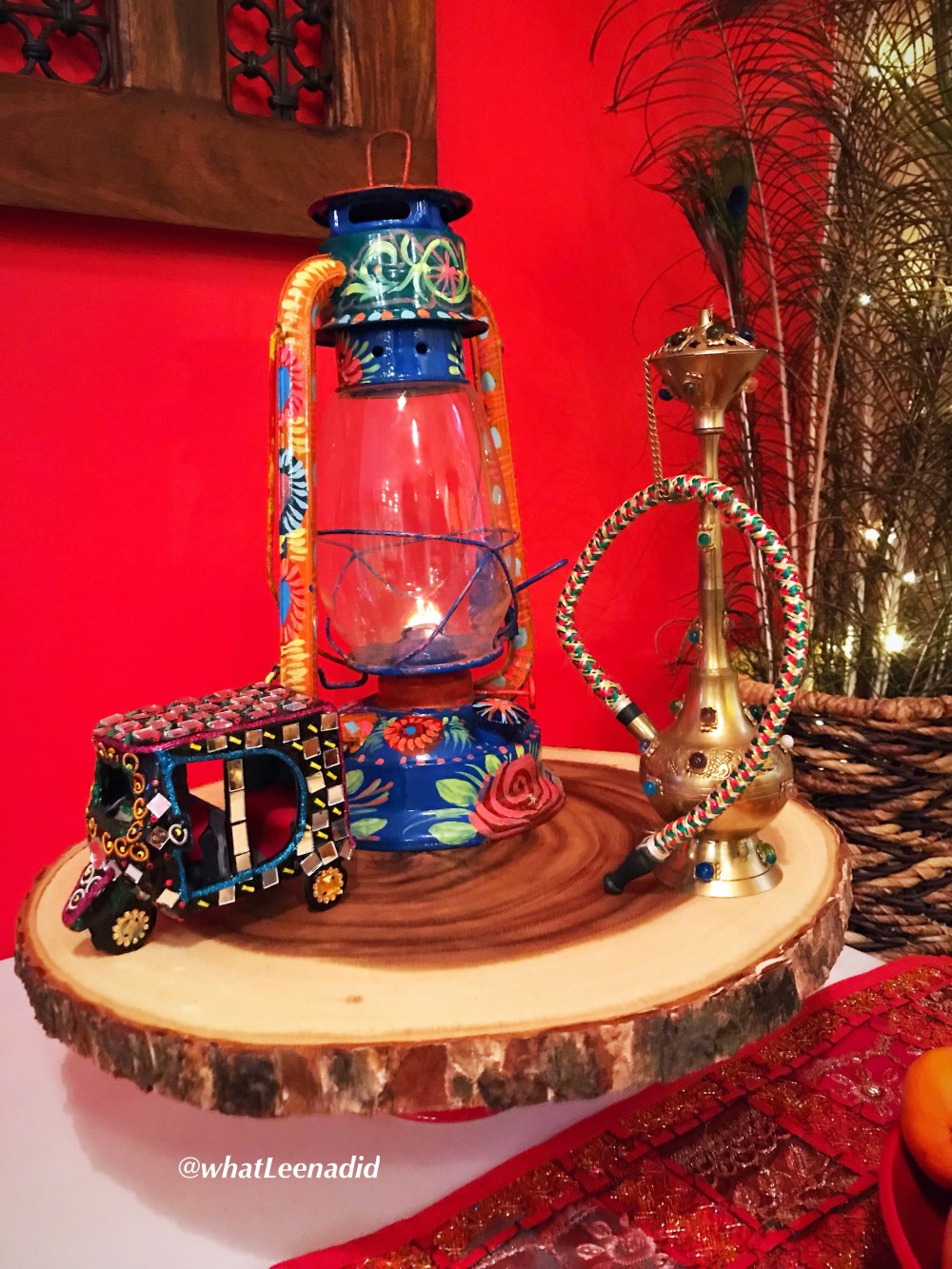 Truck art and Rickshaws are highly popular as Pakistani Art around the world. My dear friend had gifted to me this gorgeous lantern which I loved incorporating in the decor. The tiny rickshaw is most probably the one thing every family with Pakistani roots display on their mantle. Displaying these beautiful pieces on a wood platter gave a rustic feel.