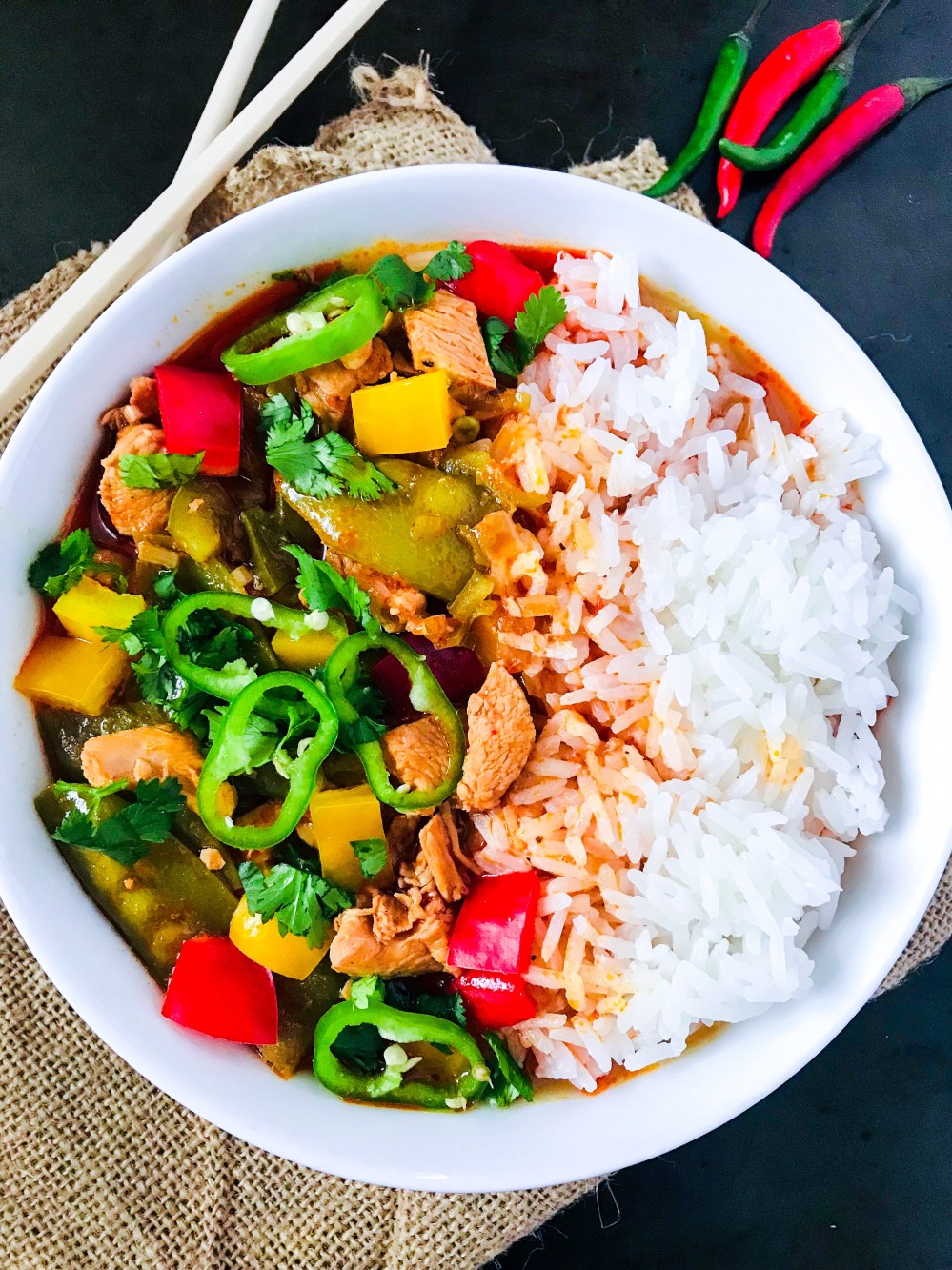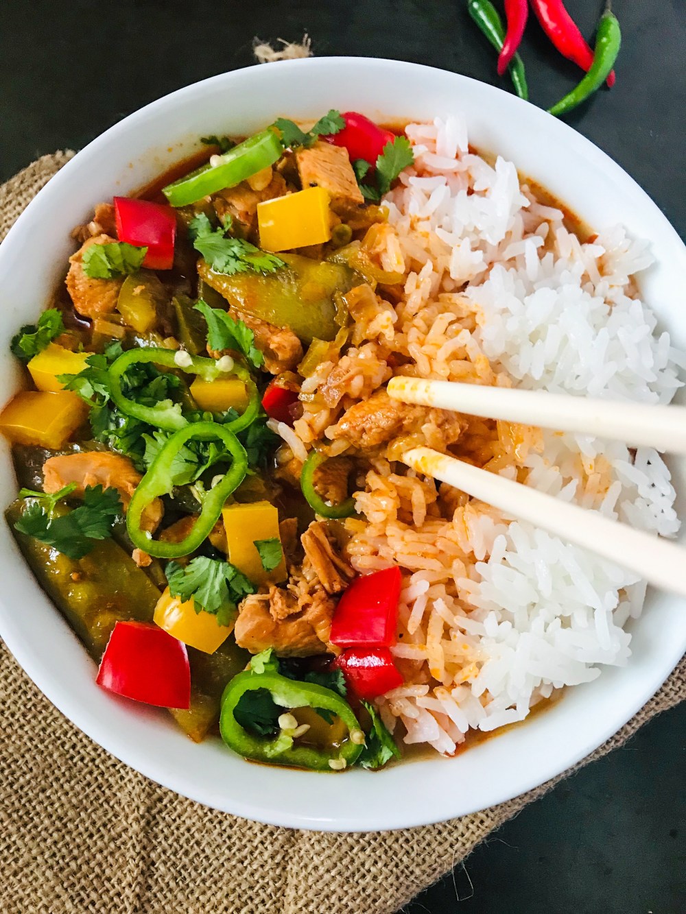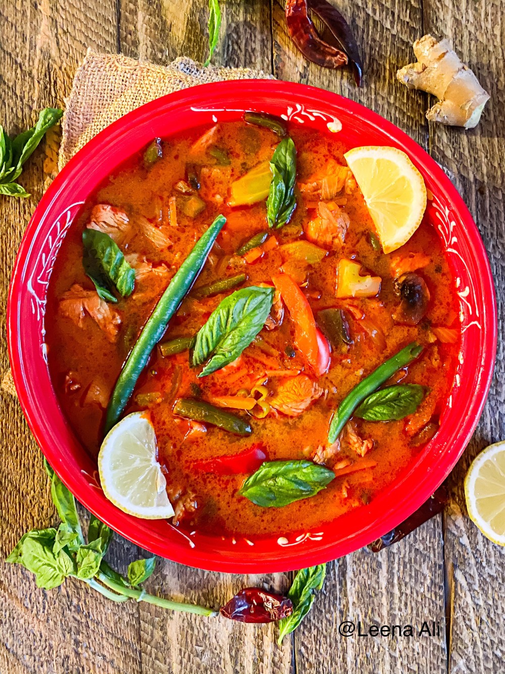 I used chicken in this recipe but you can use any protein of your choice. For the vegetables I opted for tricolor bell peppers and snow peas. You can also add baby corn, mushrooms or sugar snap peas. For a step by step tutorial, check out my Instagram @leena.ali under the Thai Red Chicken Curry highlight.