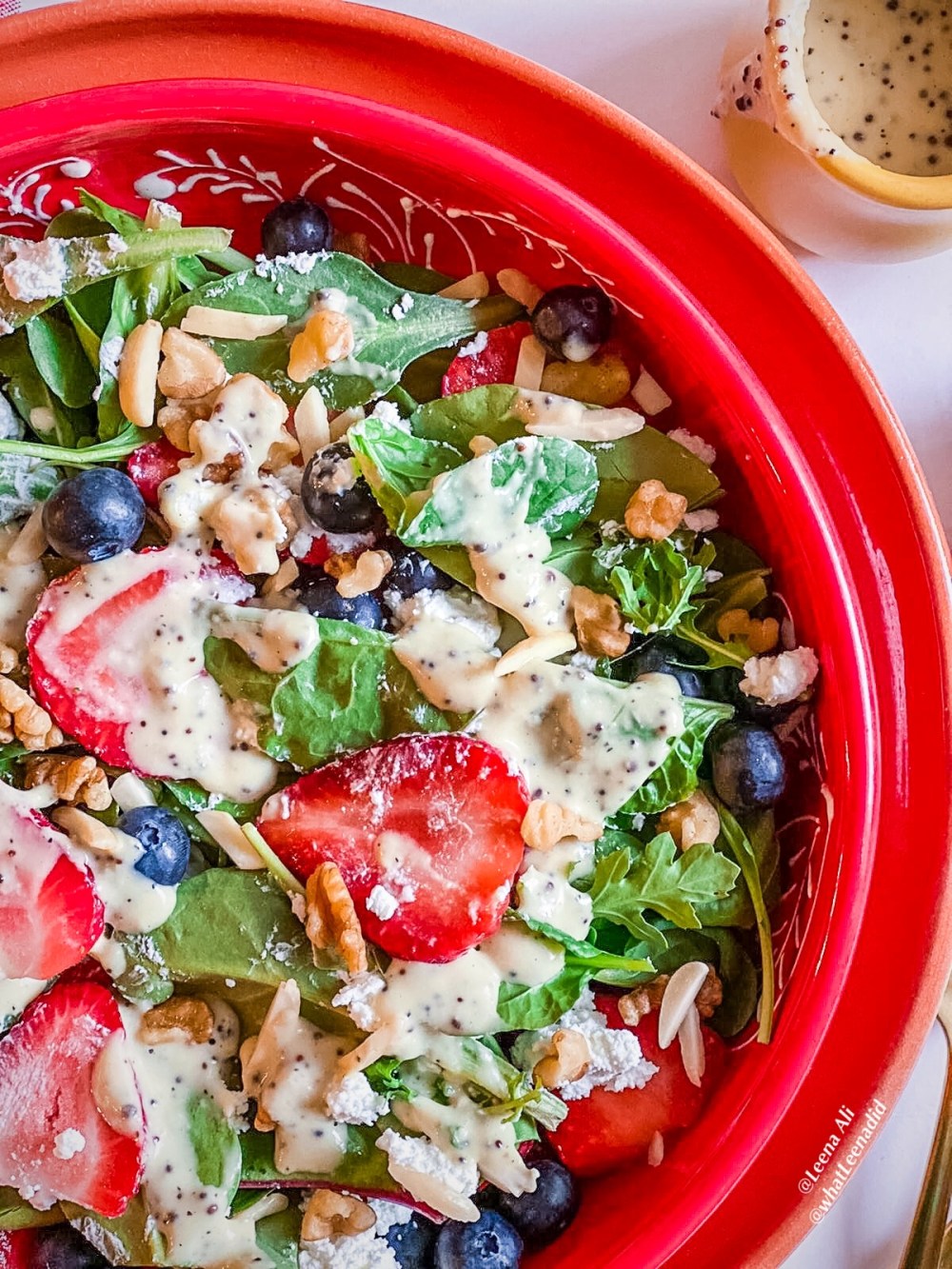 Say hello to your new favorite summer salad! It’s extremely light, very refreshing, healthy and absolutely delicious. Strawberry is mixed in with Argula, Spinach, Walnuts, Almonds, Blue berries and Feta cheese. My mouth is already watering… so delicious! I pair it with an easy Poppy seed dressing that will leave your tastebuds screaming yum at each bite! So without further delay, let’s get to the recipe!